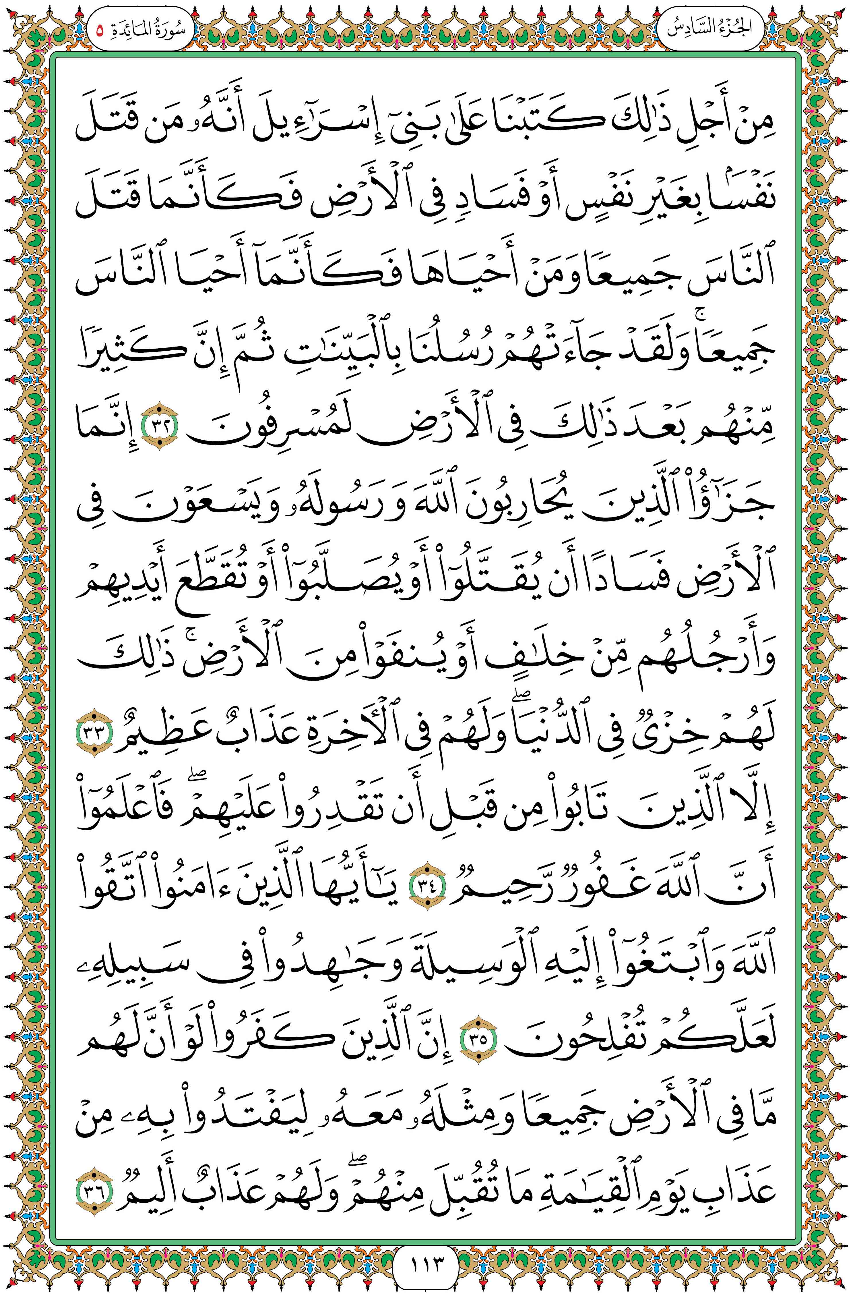 [33] إنما جزاء الذين يحاربون الله، ويبارزونه بالعداوة، ويعتدون على أحكامه، وعلى أحكام رسوله، ويفسدون في الأرض بقتل الأنفس، وسلب الأموال، أن يُقَتَّلوا، أو يُصَلَّبوا مع القتل [والصلب: أن يُشَدَّ الجاني على خشبة] أو تُقْطَع يدُ المحارب اليمنى ورجلُه اليسرى