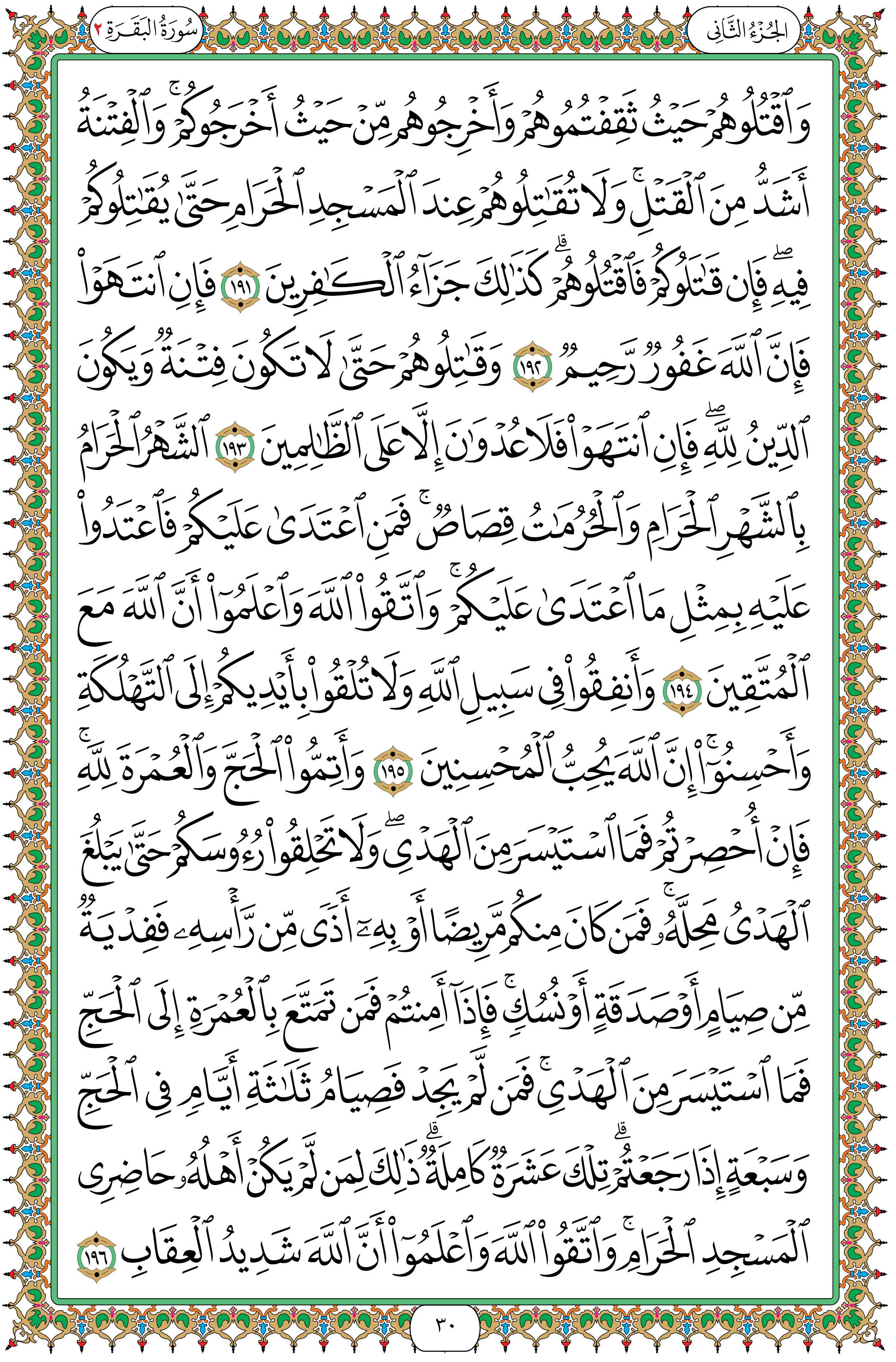 [191] واقتلوا الذين يقاتلونكم من المشركين حيث وجدتموهم، وأخرجوهم من المكان الذي أخرجوكم منه وهو «مكة». والفتنة -وهي الكفر والشرك والصد عن الإسلام- أشد من قتلكم إياهم. ولا تبدؤوهم بالقتال عند المسجد الحرام تعظيماً لحرماته حتى يبدؤوكم بالقتال فيه، فإن قاتلو