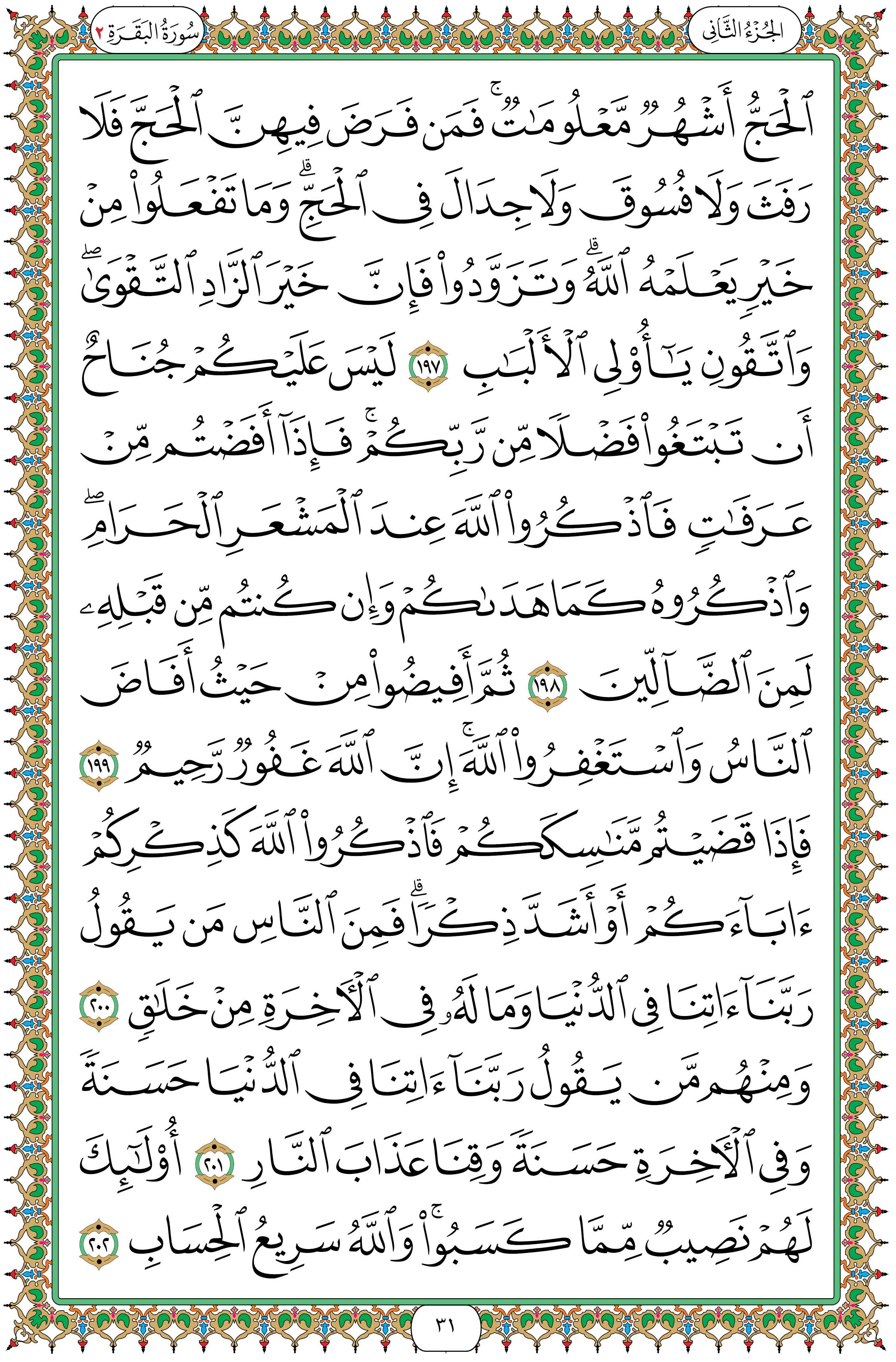 [198] ليس عليكم حرج في أن تطلبوا رزقاً من ربكم بالربح من التجارة في أيام الحج. فإذا دفعتم بعد غروب الشمس راجعين من «عرفات» -وهي المكان الذي يقف فيه الحجاج يوم التاسع من ذي الحجة- فاذكروا الله بالتسبيح والتلبية والدعاء عند المشعر الحرام -«المزدلفة»-، واذكر