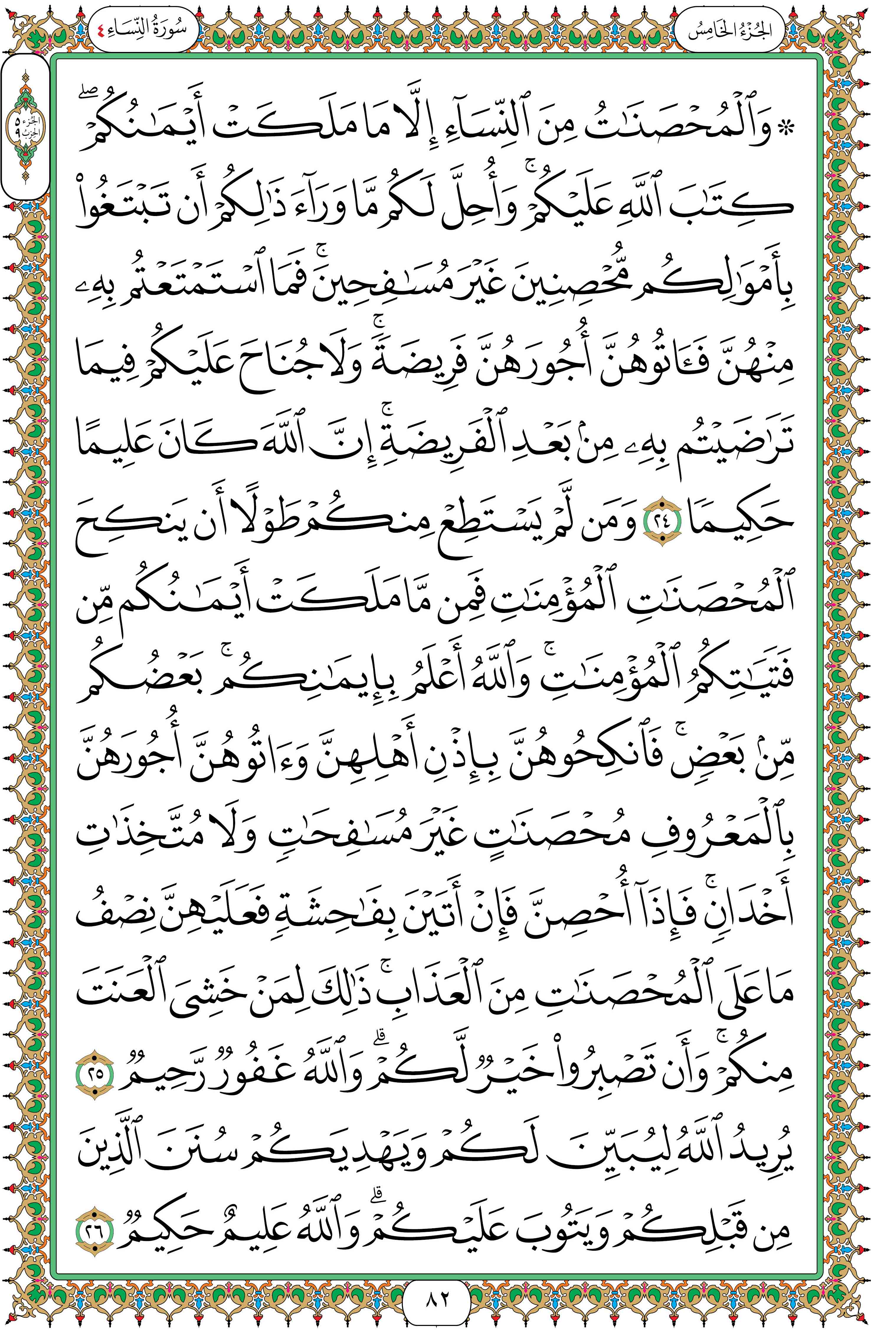 [24] ويحرم عليكم نكاح المتزوجات من النساء، إلا مَن سَبَيْتم منهن في الجهاد، فإنه يحل لكم نكاحهن، بعد استبراء أرحامهن بحيضة، كتب الله عليكم تحريم نكاح هؤلاء، وأجاز لكم نكاح مَن سواهن، ممَّا أحلَّه الله لكم أن تطلبوا بأموالكم العفة عن اقتراف الحرام. فما است